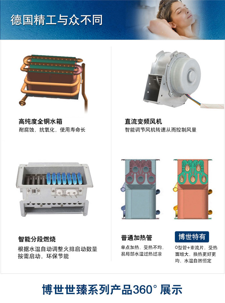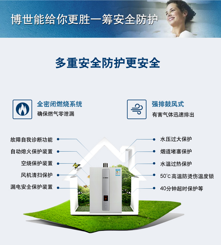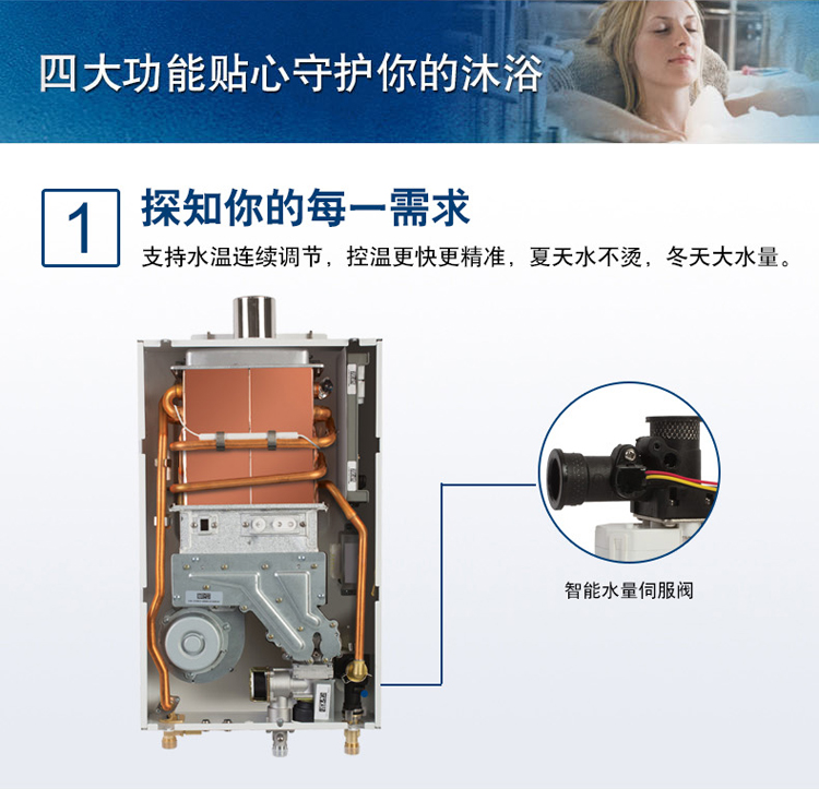 智能恒溫控制系統(tǒng),超寬頻水量調(diào)節(jié)。通過搭載伺服電機,根據(jù)設(shè)定溫度連續(xù)調(diào)節(jié)水量,舒適節(jié)能到極致。一氧化碳探測報警器,細心呵護您的安全。更有多點控制,可連接兩個遠程遙控器, 控制更方便快捷。