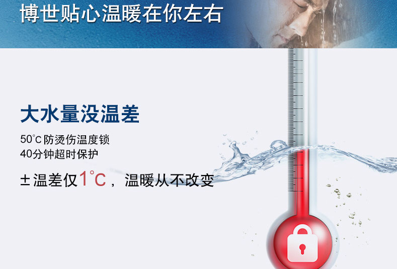 智能恒溫控制系統(tǒng),記憶合金先進技術,安全探測報警系統(tǒng),提供舒適安全沐浴。