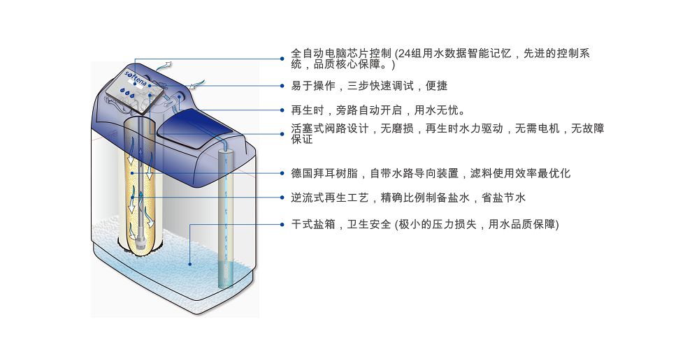 e、濾料品質(zhì)頂級、軟化效果的保障,國際先進的濾料選擇,樹脂采用德國拜耳樹脂,軟水品質(zhì)的保證。