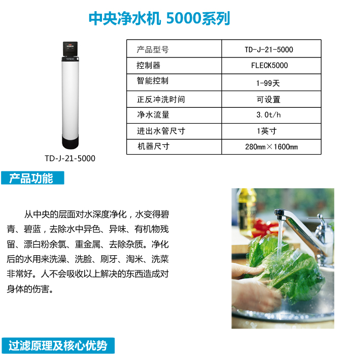 全屋凈水中央凈水機有效去除水中的異色、異味;進一步濾除水中微小雜質(zhì)、膠狀體;去除水中的漂白粉余氯、農(nóng)藥、重金屬;保留對人體有益的礦物質(zhì)。使水變得碧清、碧藍,去除對人體有害的物質(zhì)。
